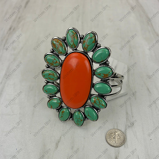 BR251230-01SL-GREEN-ORANGE Silver metal with orange and green turquoise stone large oval Bungle