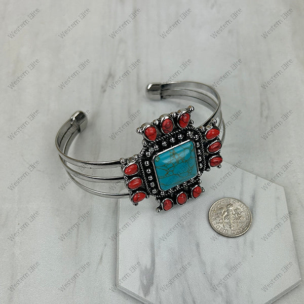 BR251230-02-RED-BLUE Silver metal with red and blue turquoise stone cross Bangle
