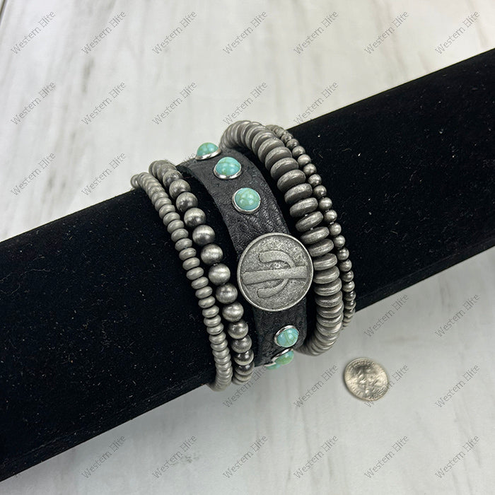 BR250308-32 Silver Navajo pearl beads and black leather with metal cactus Bracelet sets