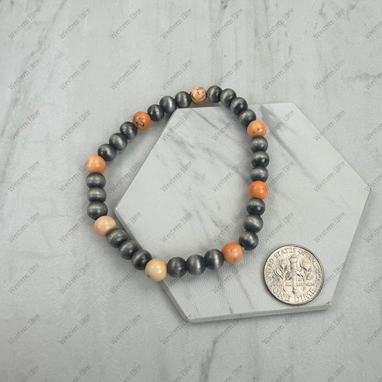 BR251228-41 6 mm silver Navajo pearl with orange turquoise stone beads stretch Bracelet