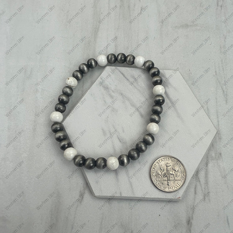 BR251228-42 6 mm silver Navajo pearl with white turquoise stone beads stretch Bracelet
