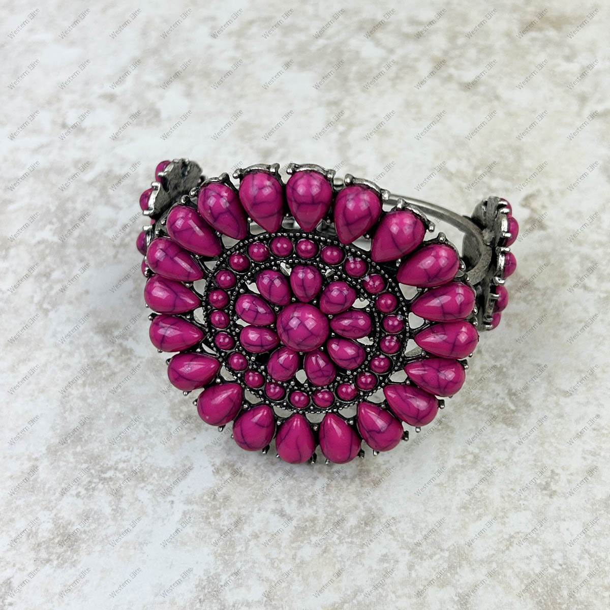 BR211230-01-PINK-SILVER Silver with hot pink stone Concho Cuff Bracelet