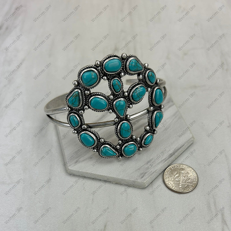 BR250930-01-BLUE Silver metal with blue turquoise stone peace sign Bangle