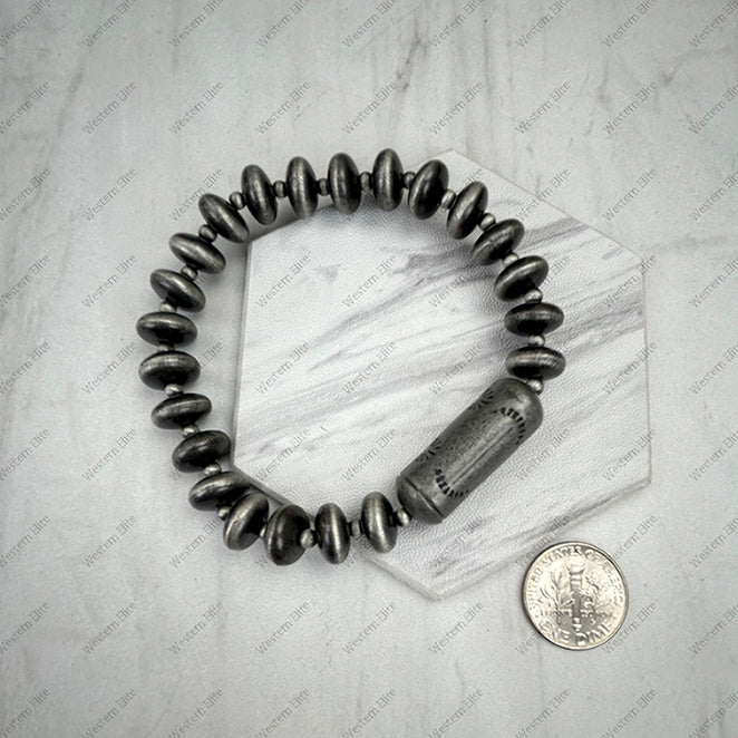 BR251219-01 Silver Navajo pearl roundel and barrel beads stretchy Bracelet