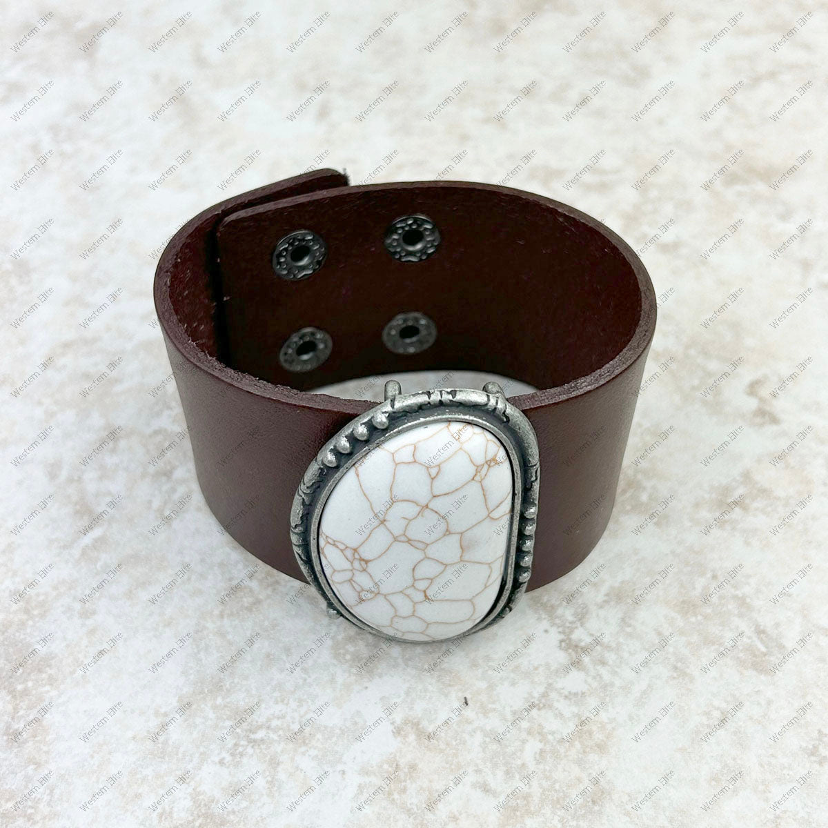 | White Stone with Dark Brown Leather Cuff Bracelet |