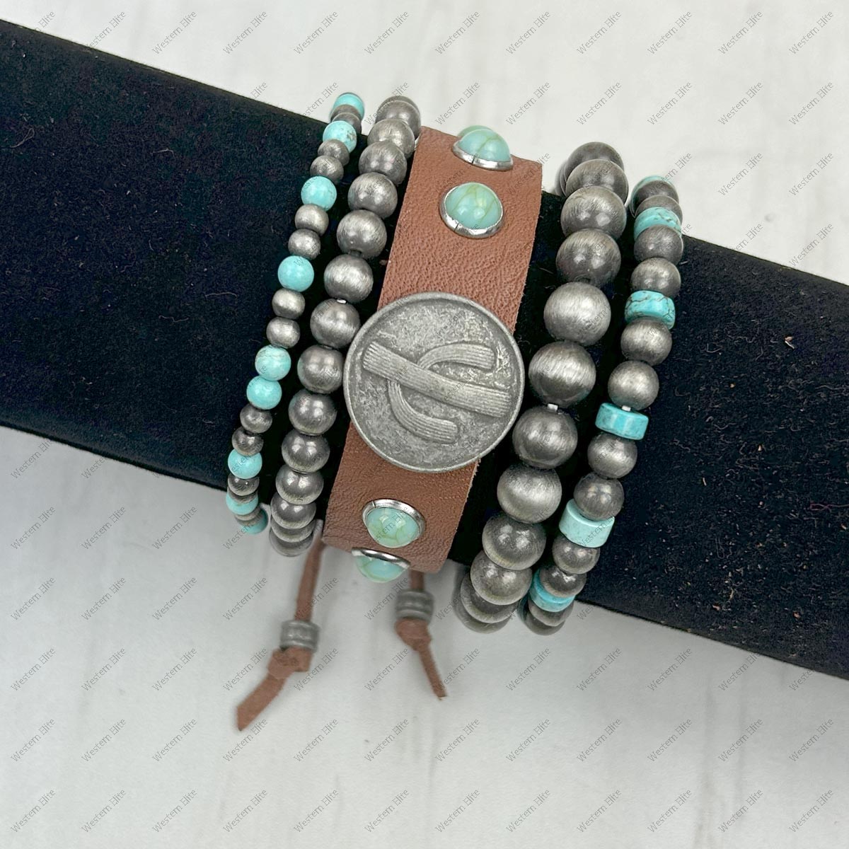 BRZ240311-02 Silver Navajo pearl with blue turquoise stone beads Bracelet set