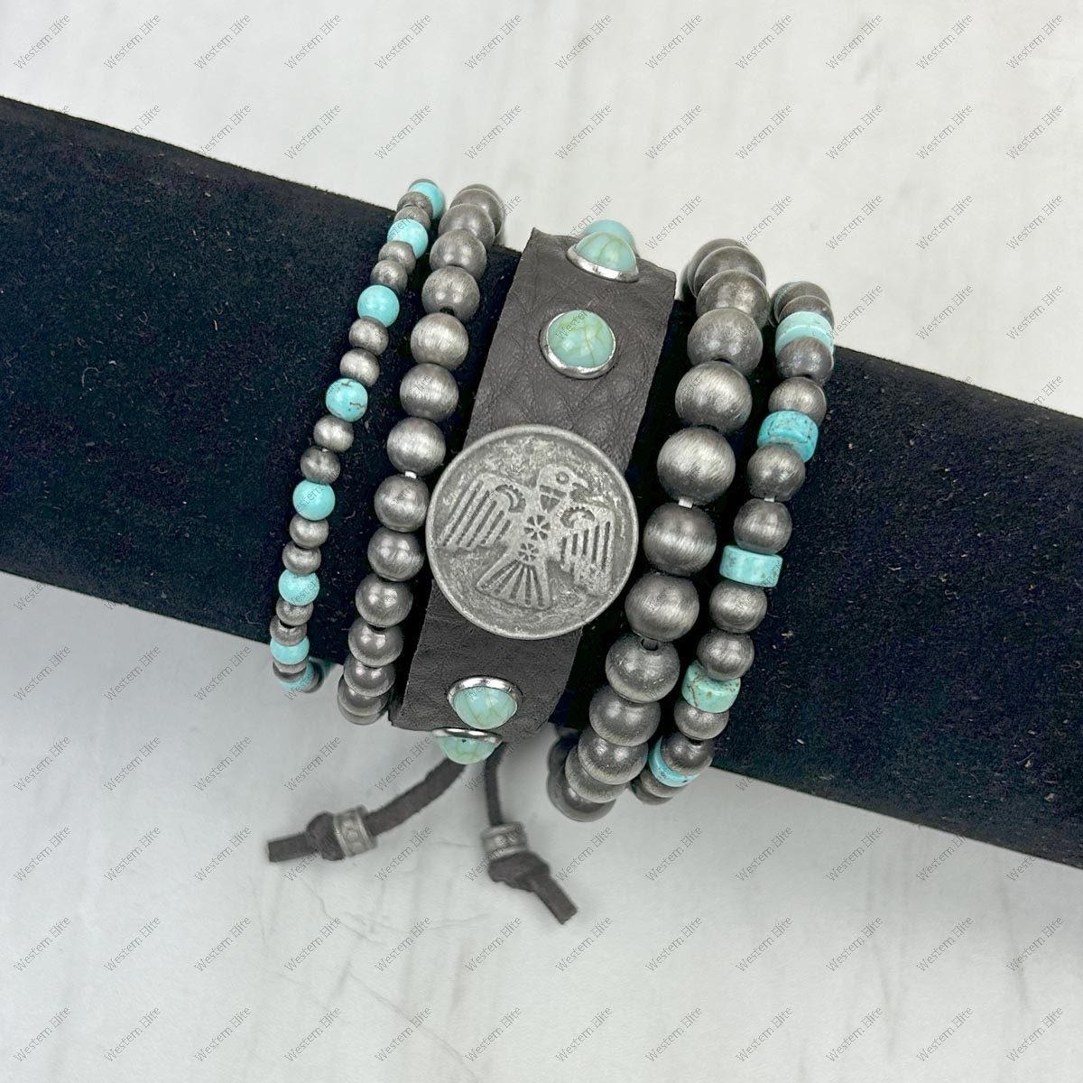 BRZ240311-07 Silver Navajo pearl with blue turquoise stone beads Bracelet set