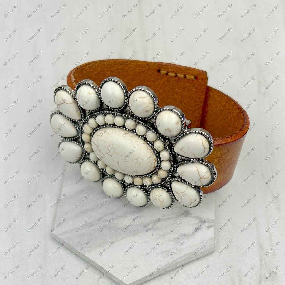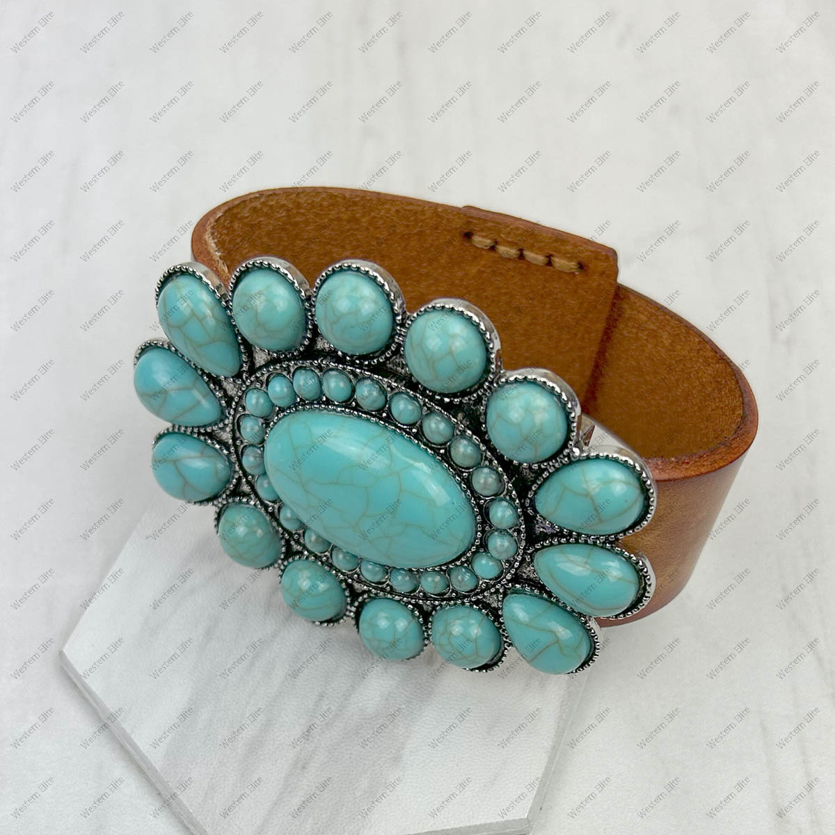 NKZ231226-14 Brown leather with large blue turquoise stone oval concho bracelet