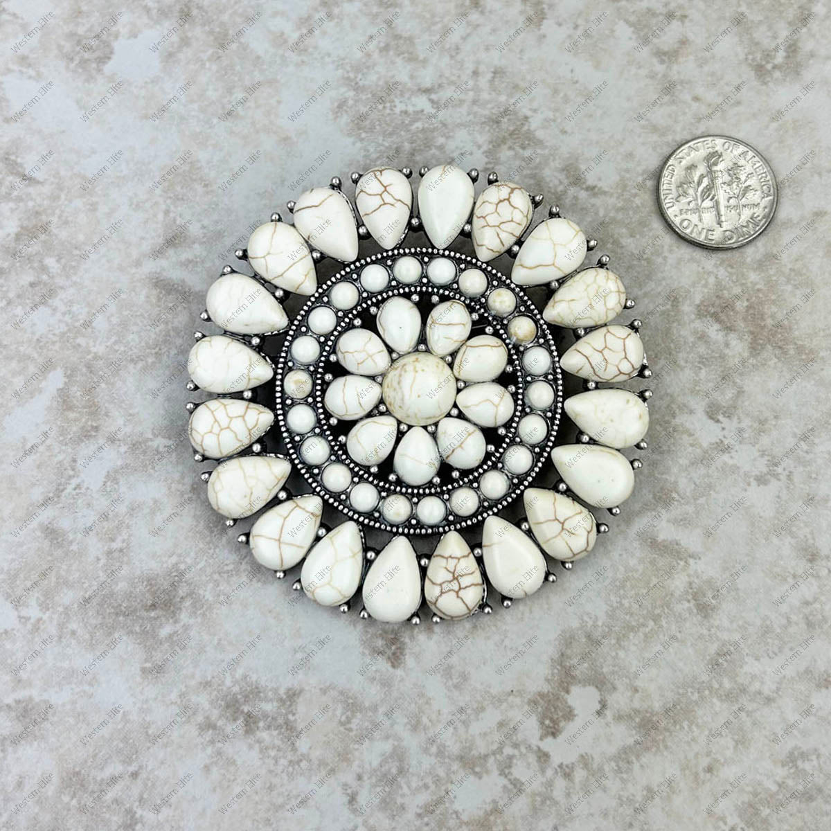 BCH220630-01-WHITE Large silver with white stone concho Brooch