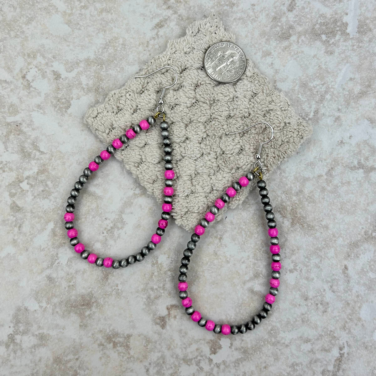 ER190810-08-PINK-SILVER "Silver Navajo pearl with hot pink stone beads teardrop hoop Earrings"