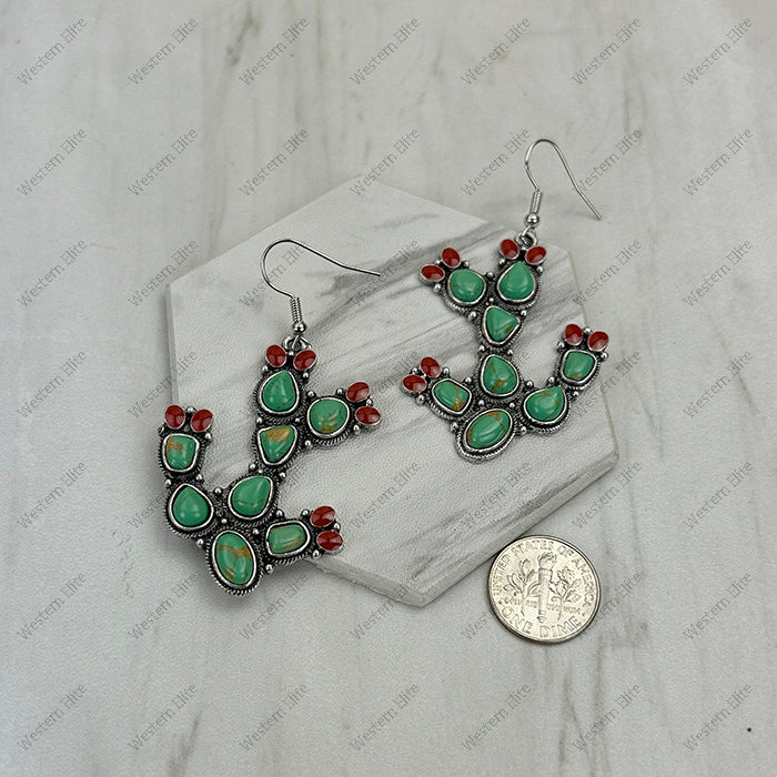 ER250930-01-BLUE Silver metal with blue oval turquoise stone cactus Earring