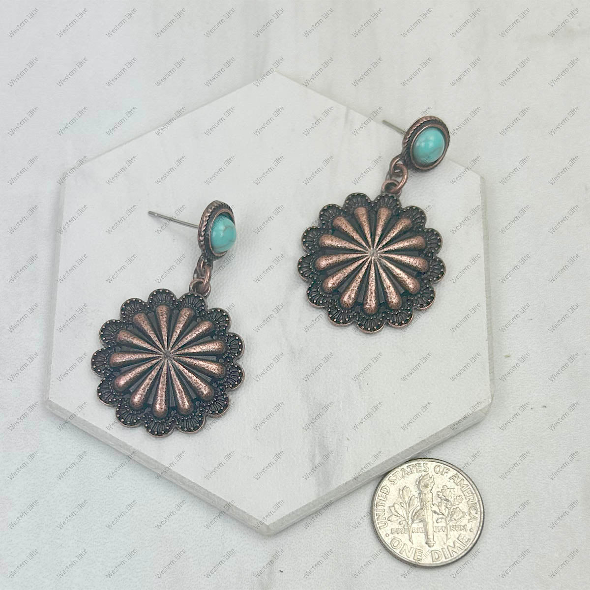 ER240530-01COPPER-BLUE Copper metal flower concho with blue turquoise stone Earrings