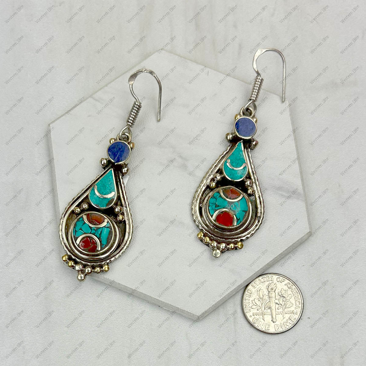 ER240722-10 German silver with blue turquoise and red coral Earrings