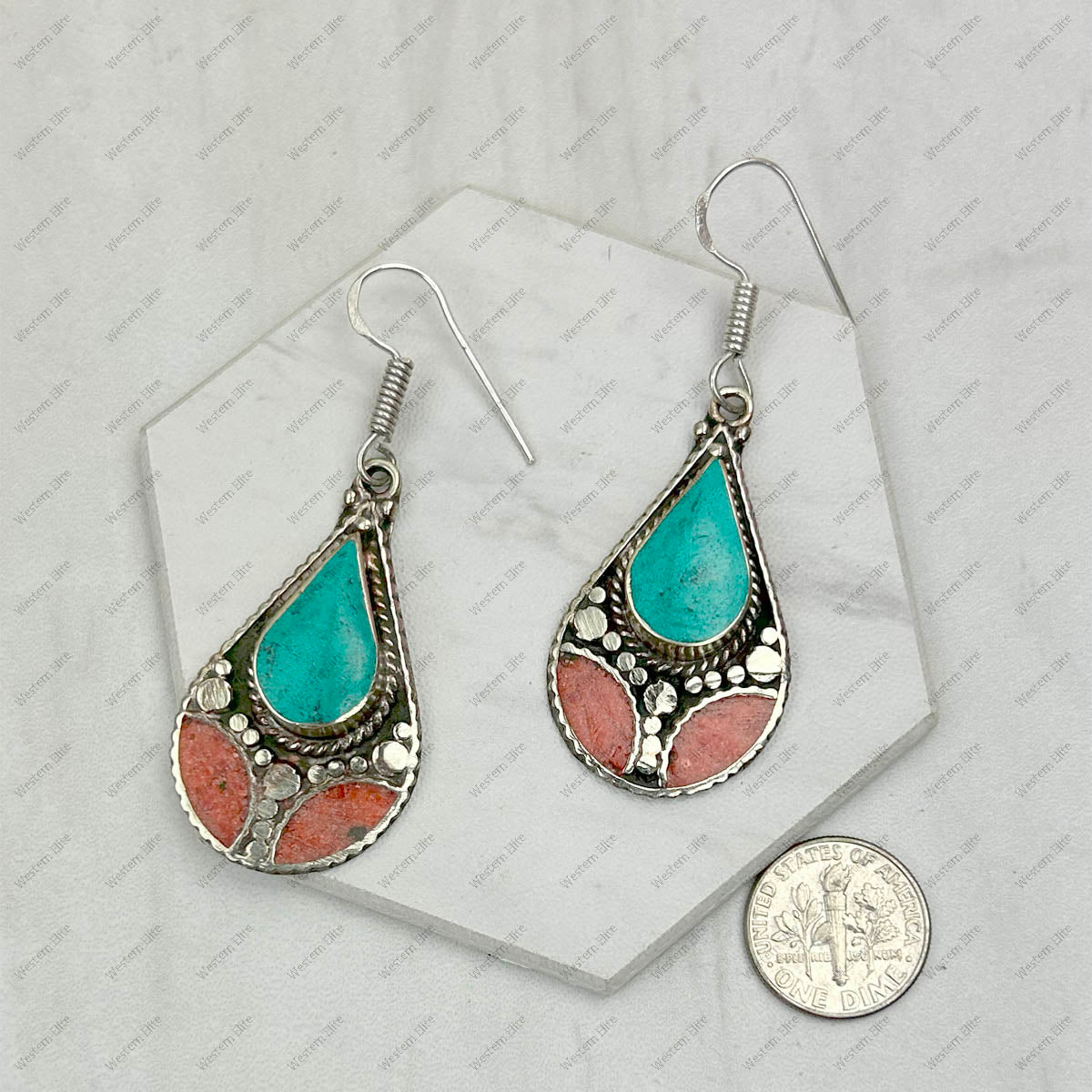 ER240722-11 German silver with blue turquoise and red coral Earrings
