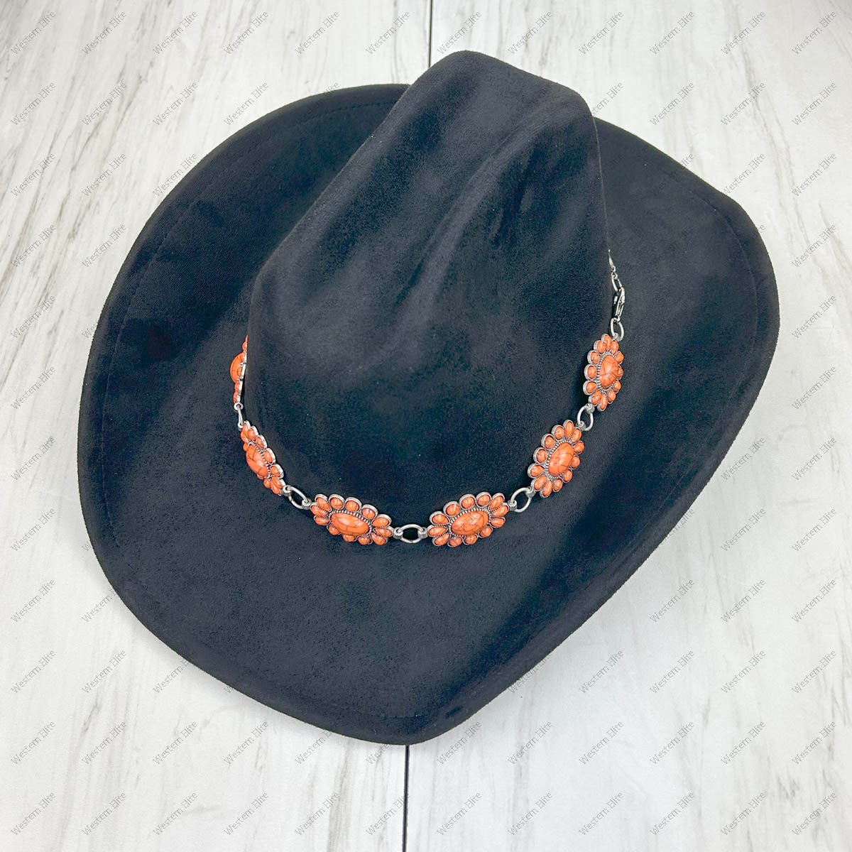 HATC030224-05 silver oval metal with orange stone hat decor chain.
