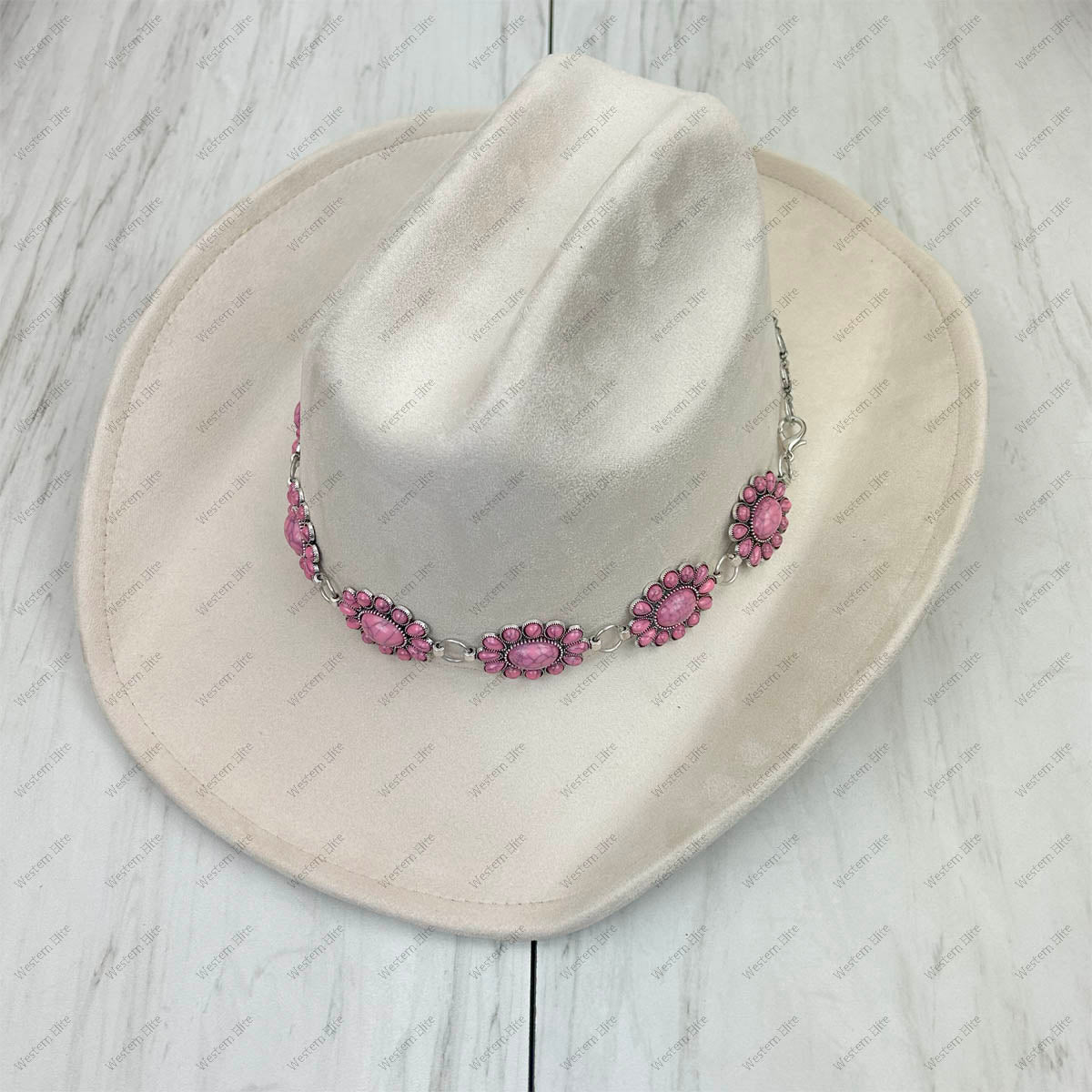 HATC030224-07 silver oval metal with light pink stone hat decor chain.