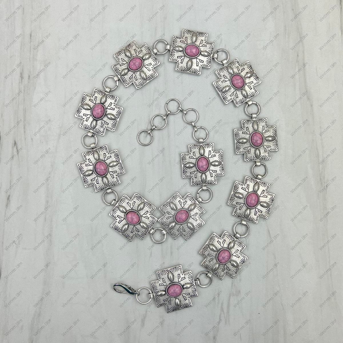 silver metal cross with light pink stone hat decor chain.