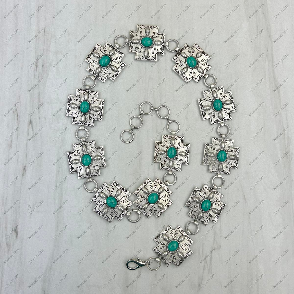 HATC030224-13 silver metal cross with green turquoise stone hat decor chain.