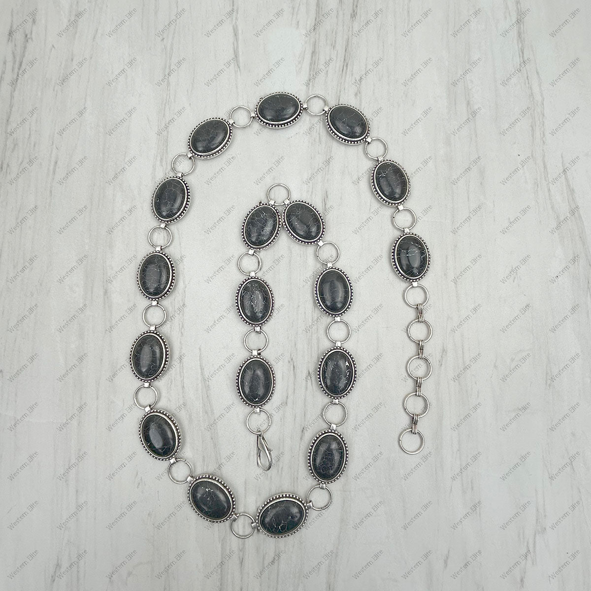 BLT241130-01-BLACK 42 Inches silver metal with black oval stone chain belts