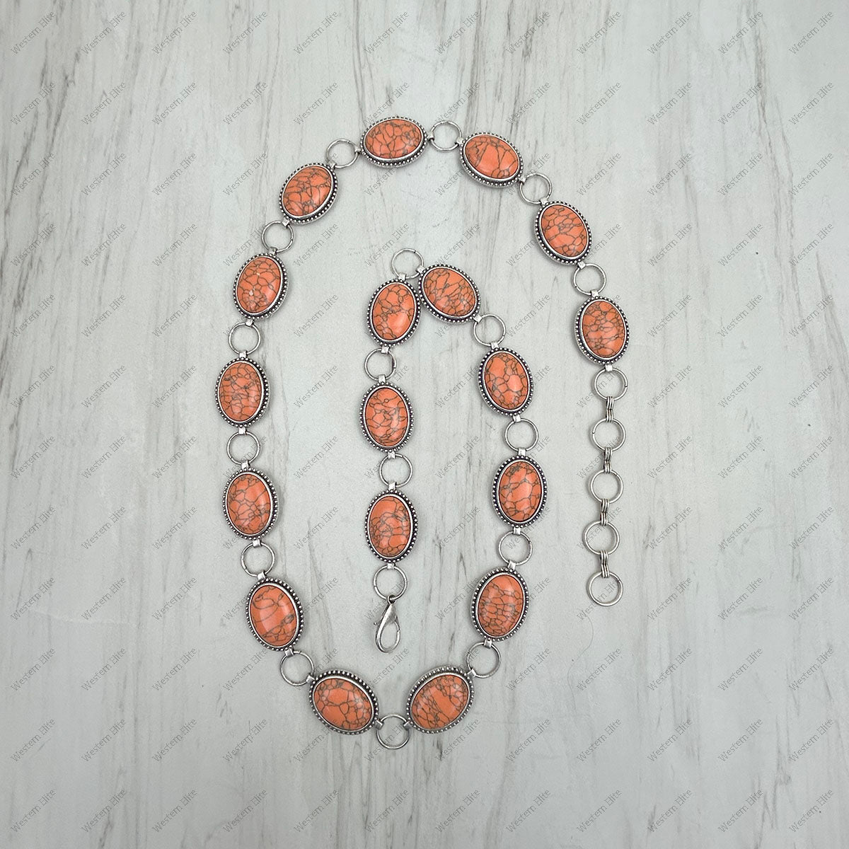 BLT241130-01-ORANGE 42 Inches silver metal with orange oval stone chain belts