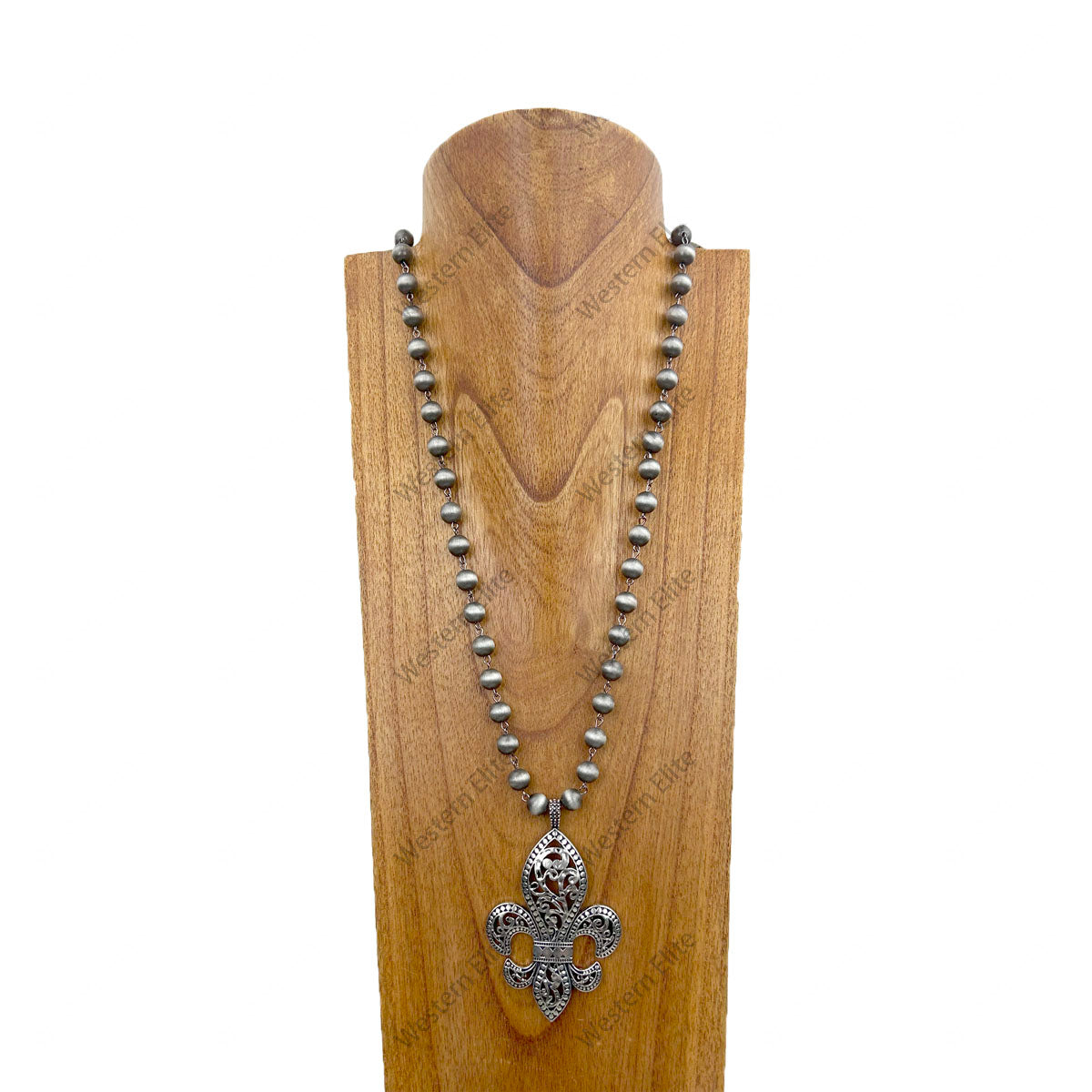 NKZ240414-03 34 inches silver Navajo pearl beads chain with metal Fleur de Lis Necklace
