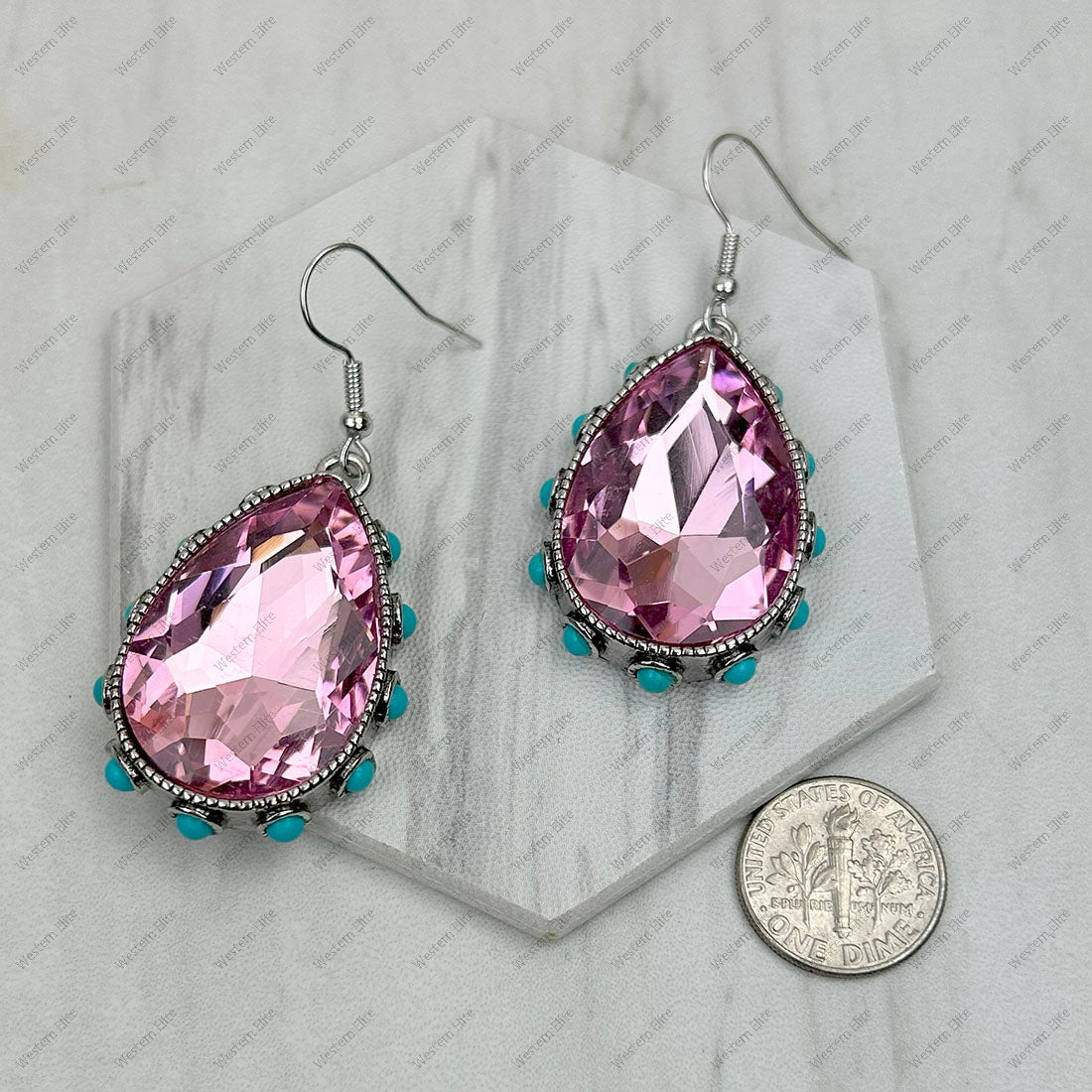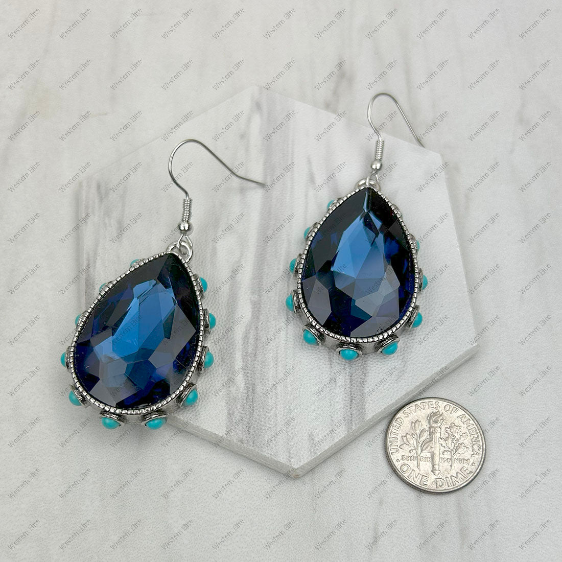 Silver metal with clear crystal and blue turquoise stone beads teardrop Earrings