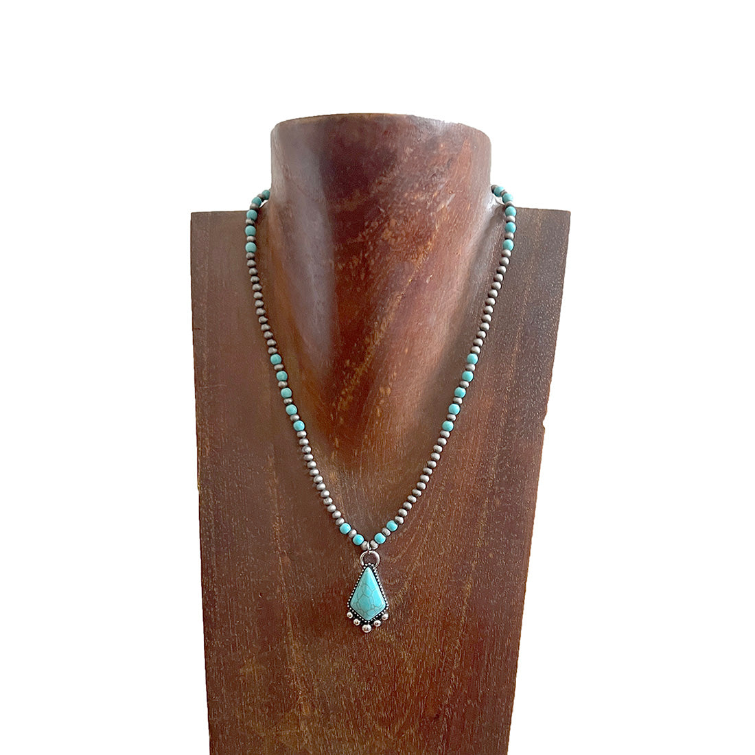 NKS250908-01-BLUE 17'' L 4mm Blue TQ & silver Navajo pearl beads with diamond shape blue TQ pendent Necklace