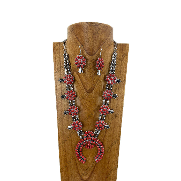 NKY181230-07 21‘’ Silver Navajo pearl and red stone beads with metal squash blossom Pendent Necklace (Copy)