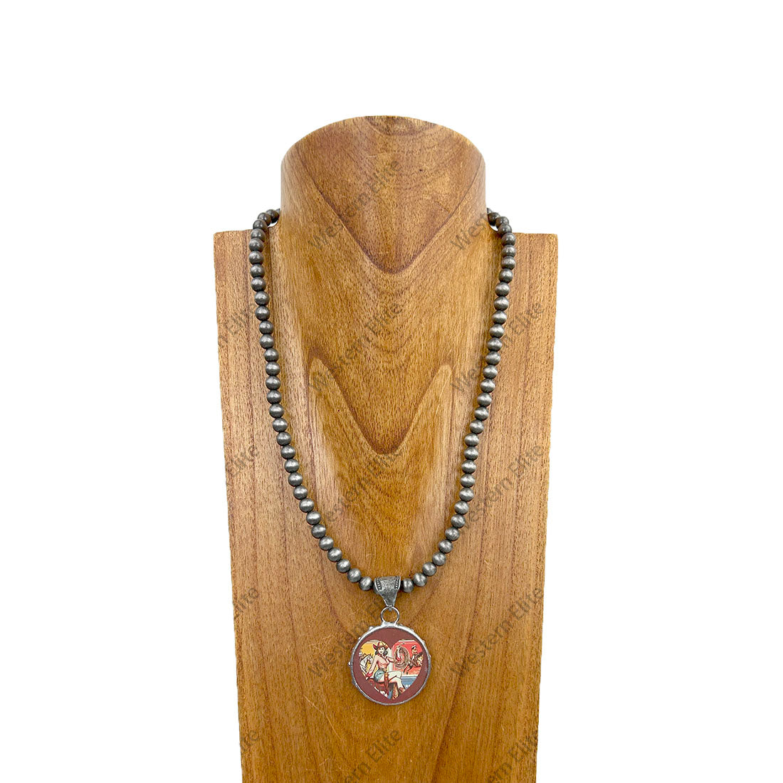 NKY241221-08 23'' Silver Navajo pearl beads with circle western design pendent Necklace