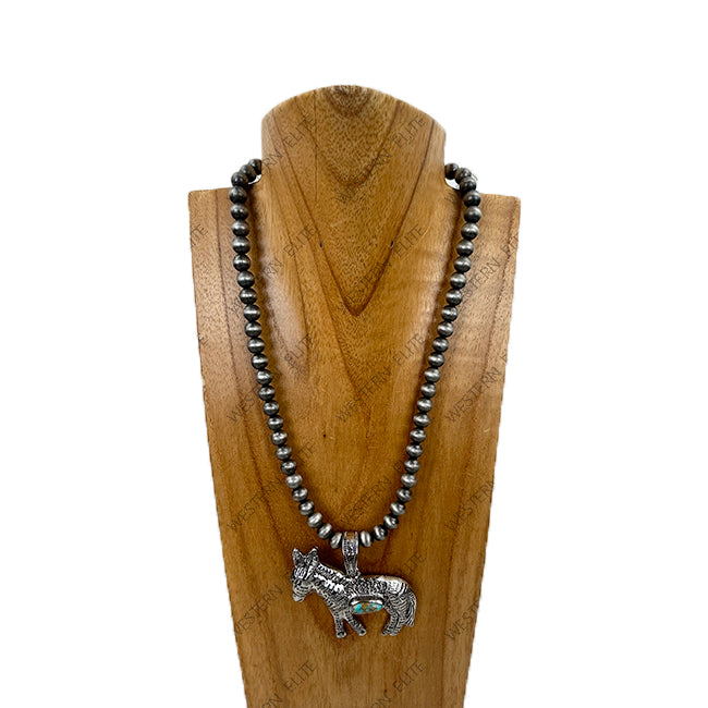 NKY251231-44 18'' Silver Navajo pearl beads with silver metal donkey with blue & brown stone center piece pendent Necklace