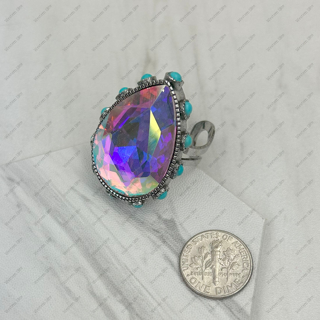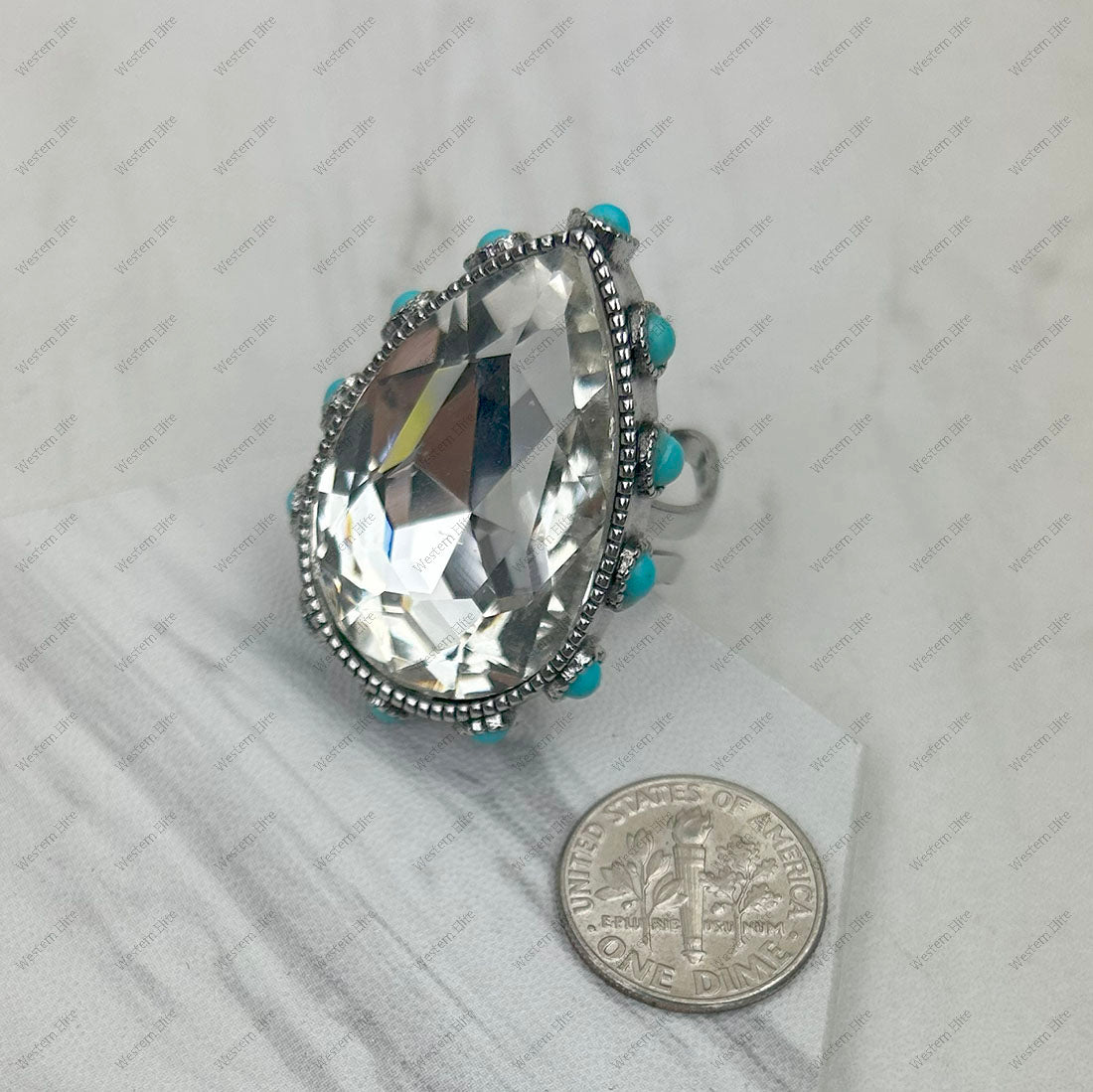 Silver metal with clear crystal and blue turquoise stone beads Ring