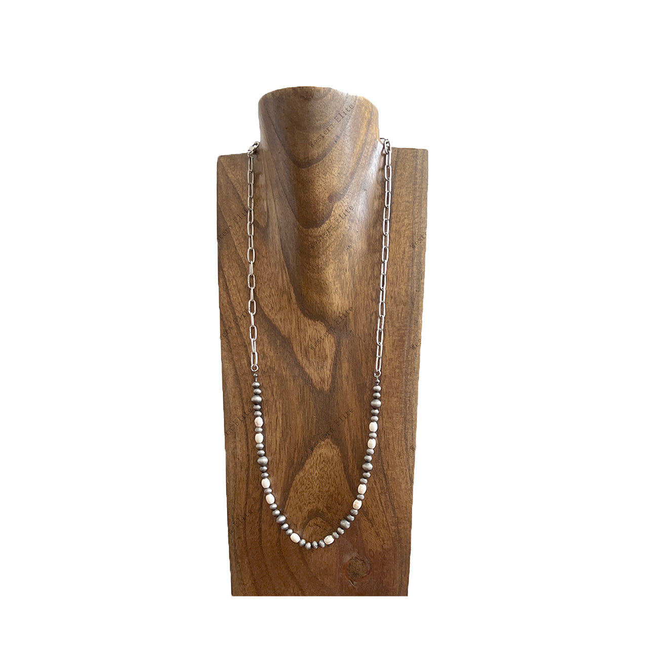 28‘’ L Blue TQ beads and Navajo pearl beads with silver metal paper clip chain Necklace