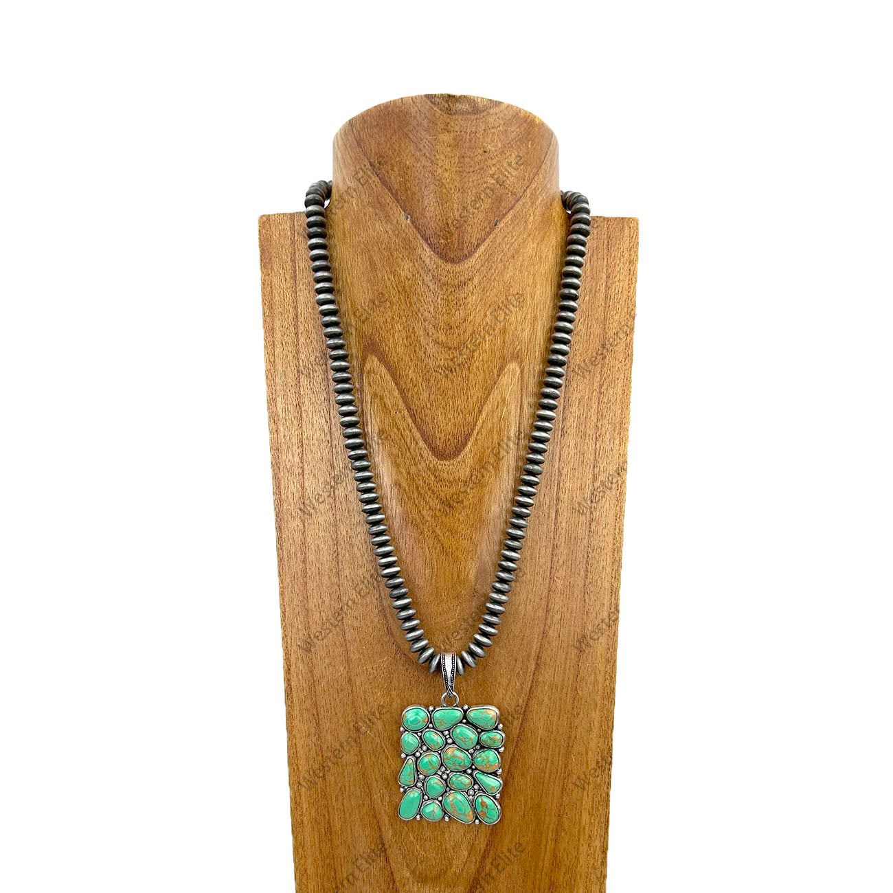NKY250608-21 Silver Navajo pearl flat roundel beads with rectangle green turquoise stone pendant Necklace
