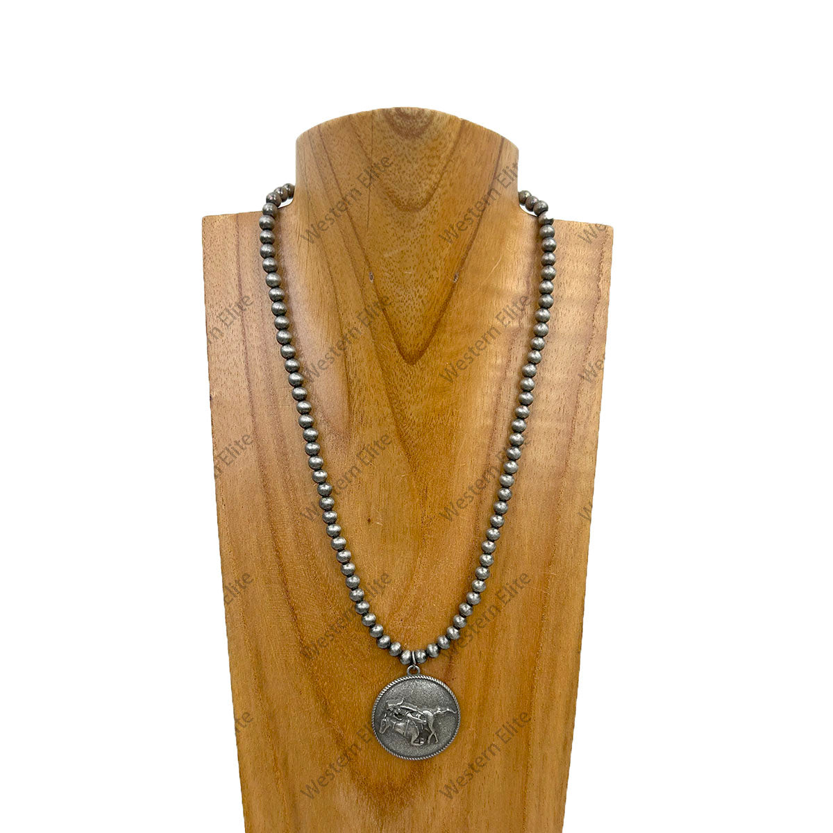 NKY250525-11 18'' 6mm Silver Navajo pearl beads with western cowgirl pendant Necklace