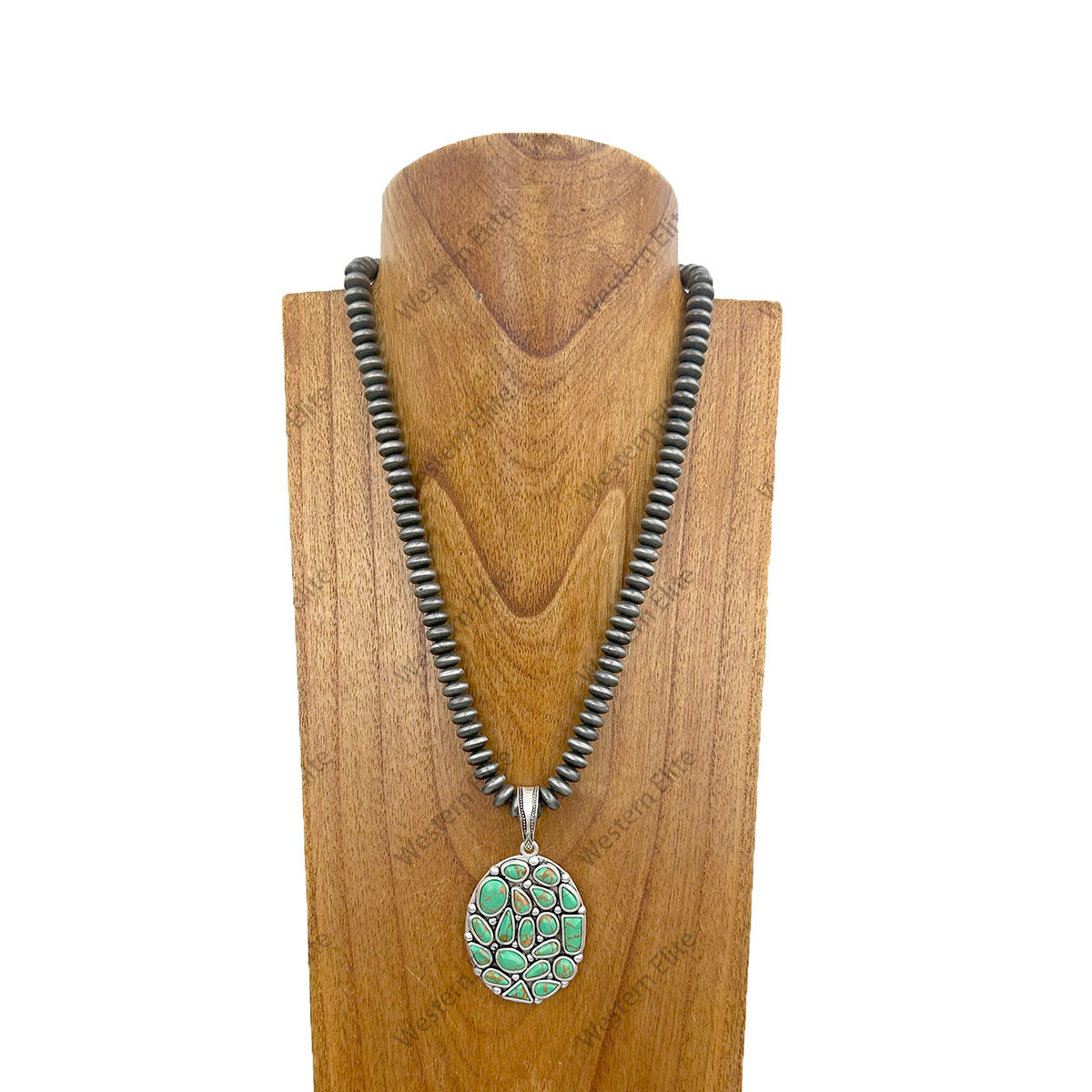 NKY250525-23 24'' Silver flat roundel Navajo pearl beads with oval green stone pendant Necklace