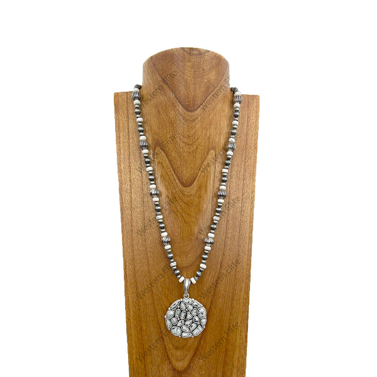 NKY250525-30 24'' Silver Navajo pearl and white stone beads with circle white stone pendant Necklace
