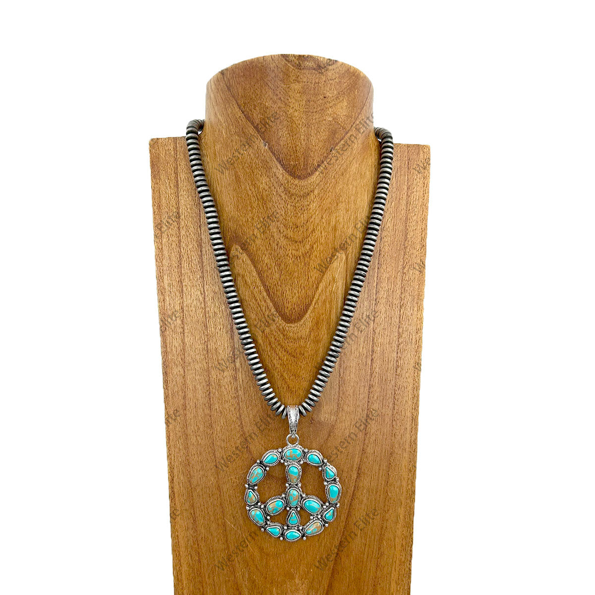 20'' Silver Navajo pearl flat roundel beads with blue turquoise stone peace sign pendant Necklace