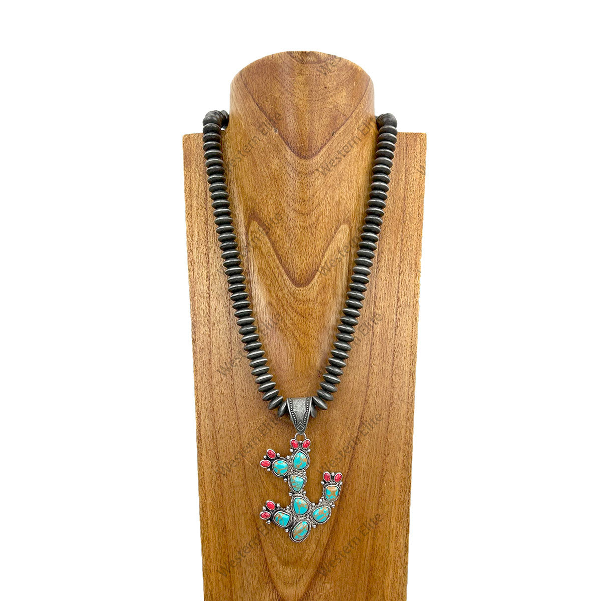 24'' silver navajo pearl beads with blue turquoise stone cactus pendant Necklace