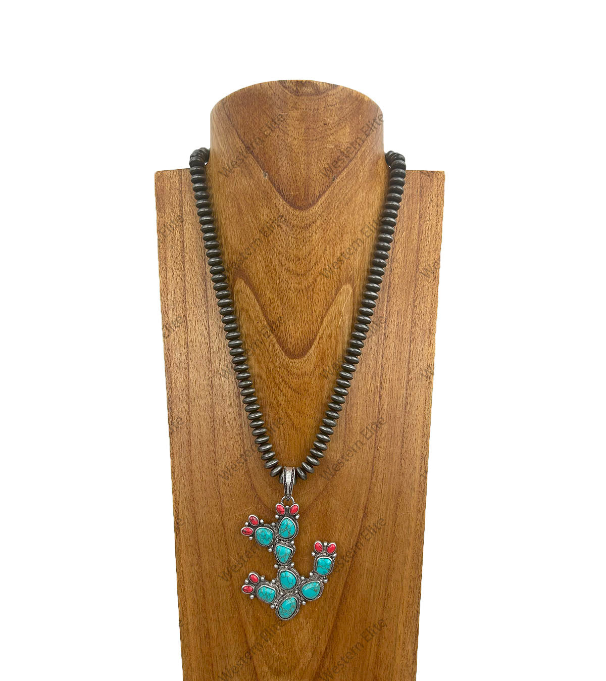 21’' silver Navajo pearl beads with blue turquoise stone cactus pendant Necklace
