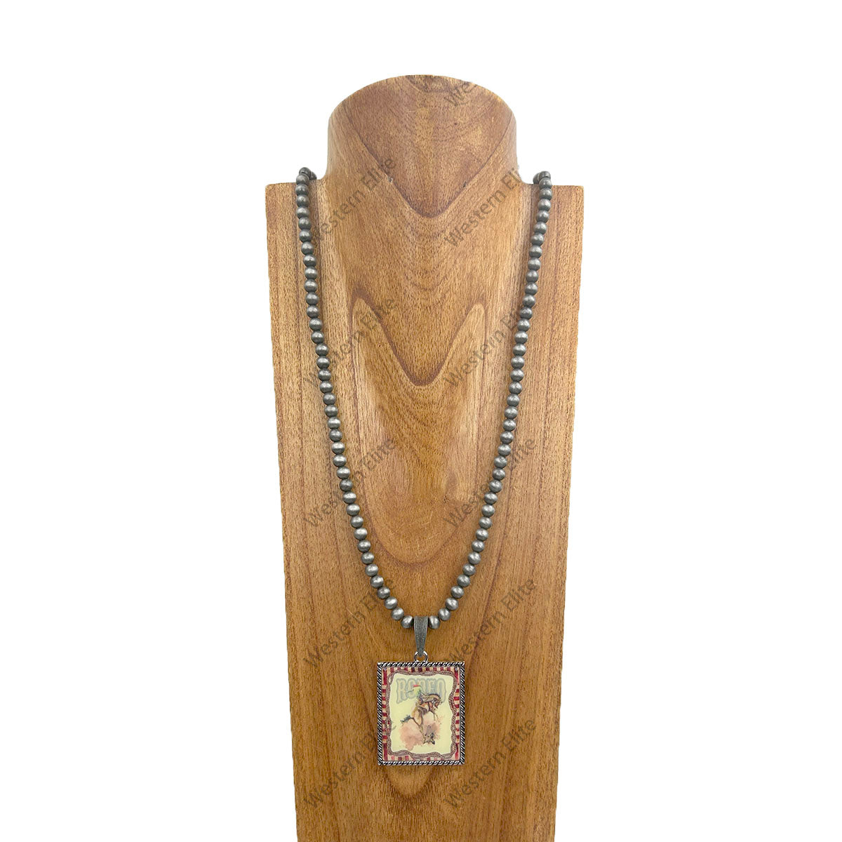 NKY250330-27 32 inches 8mm silver Navajo pearl beads with rectangle western pendent Necklace