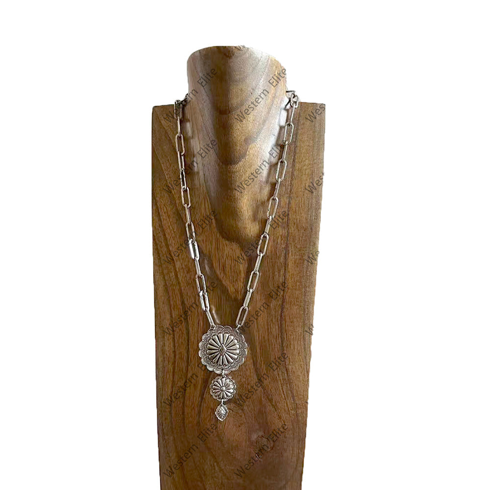 24 ‘’ silver plating clip chain Necklace with round concho Pendent