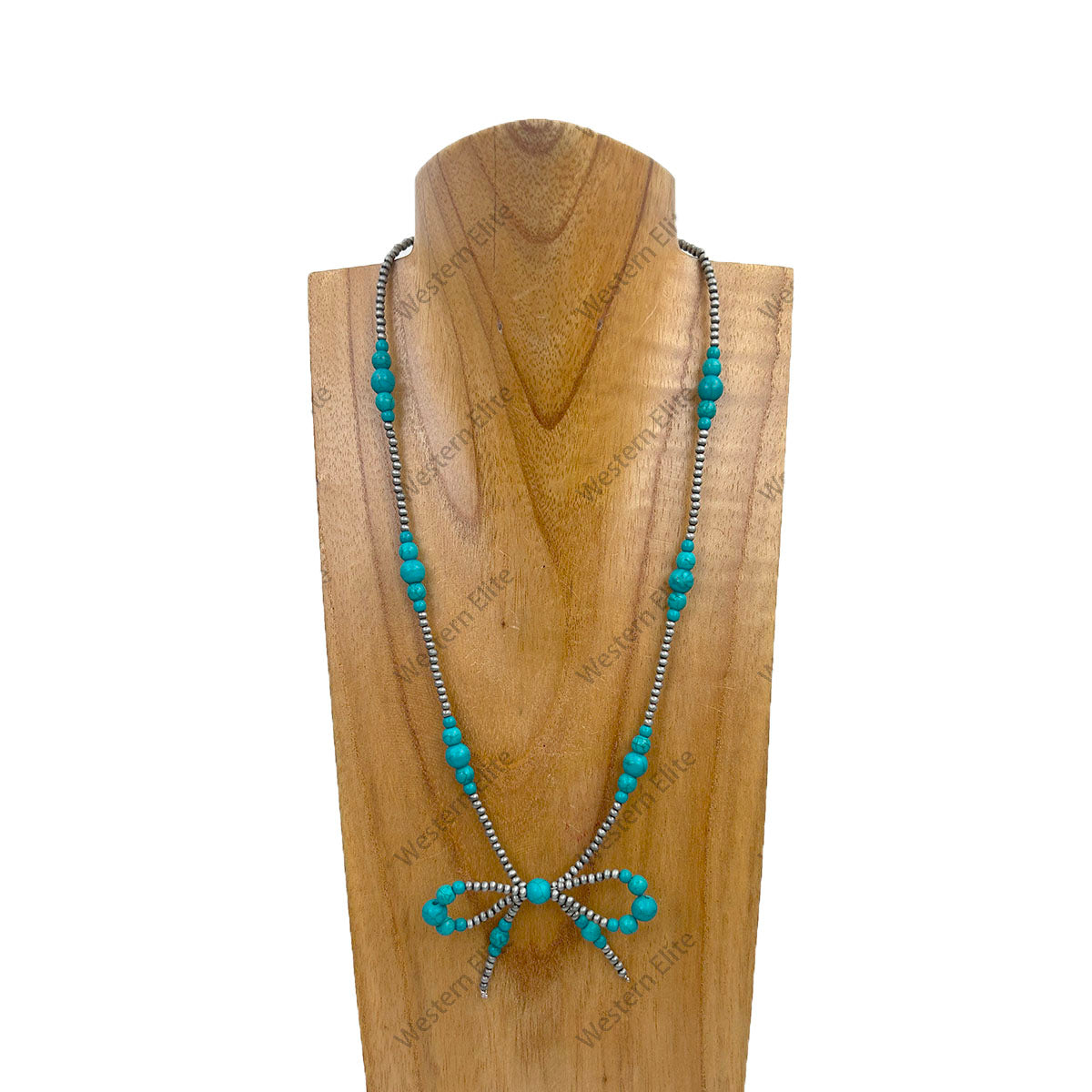 NKY250223-02 21 inches Silver Navajo pearl with green turquoise stone beads with bow tie Necklace