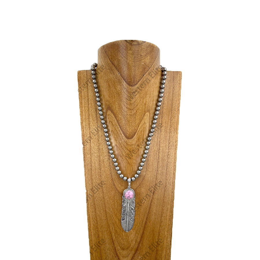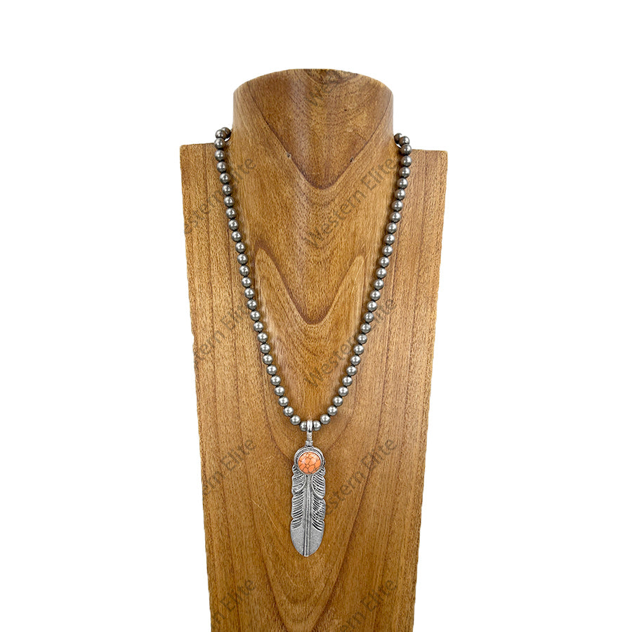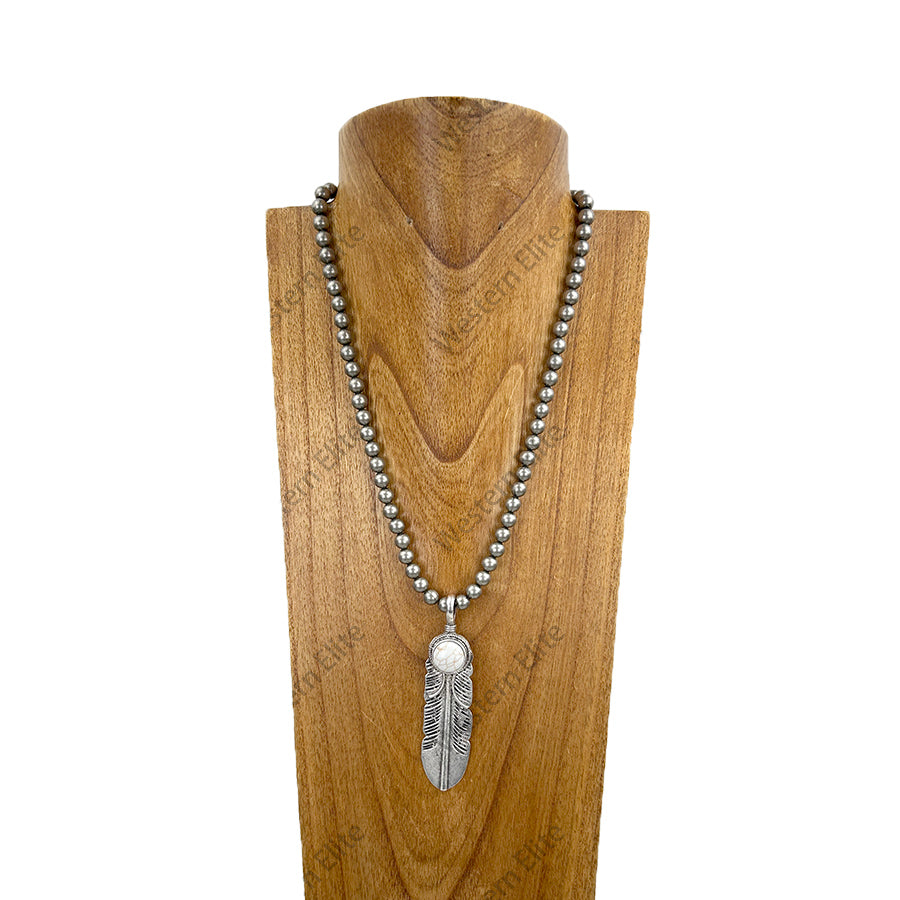NKY251206-15 21'' Silver round metal beads with silver metal feather pendent Necklace