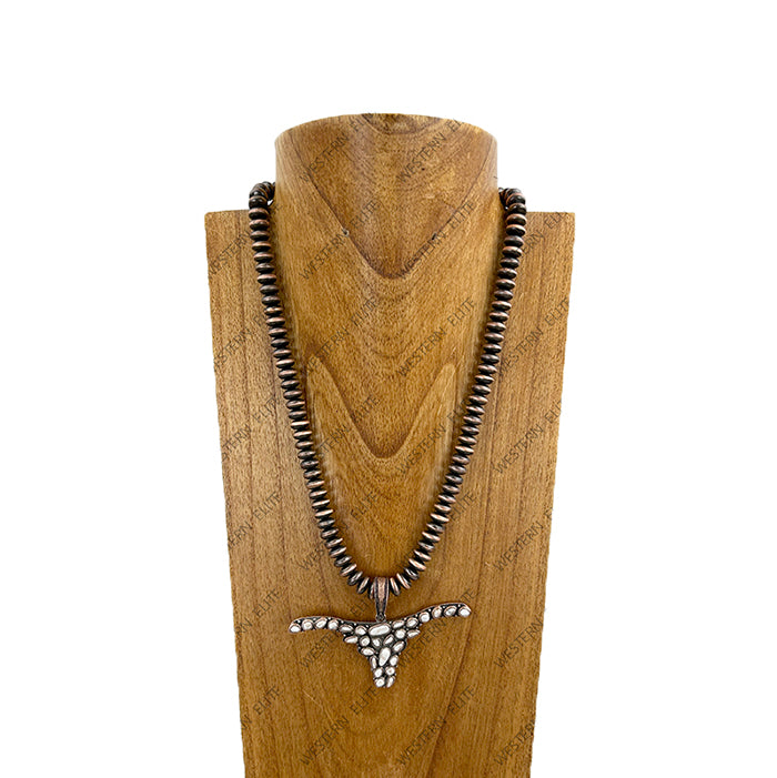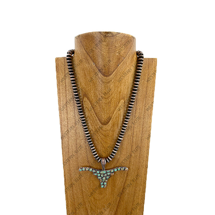 22'' Copper roundel Navajo pearl beads with blue turquoise stone long horn pendent Necklace
