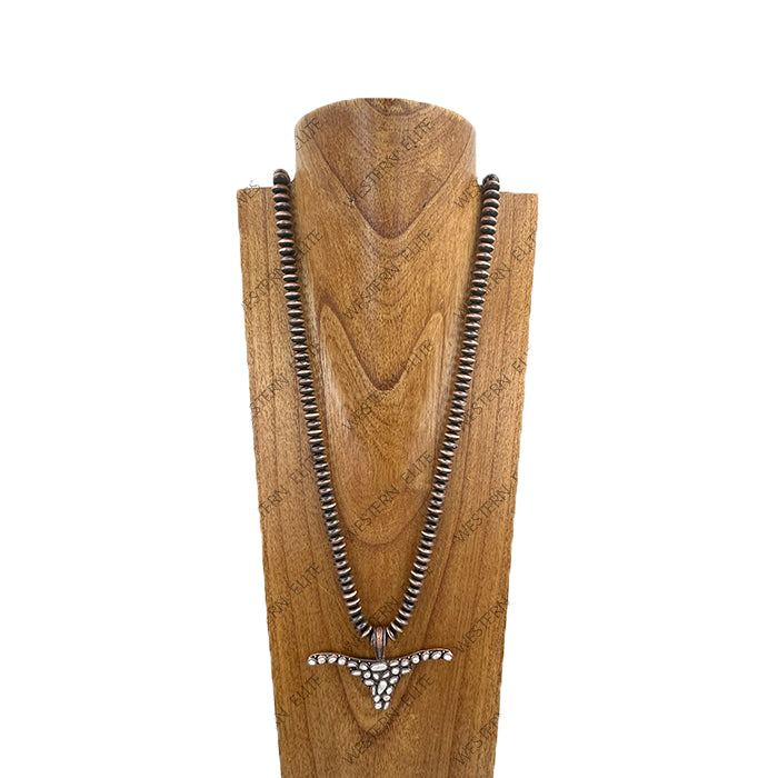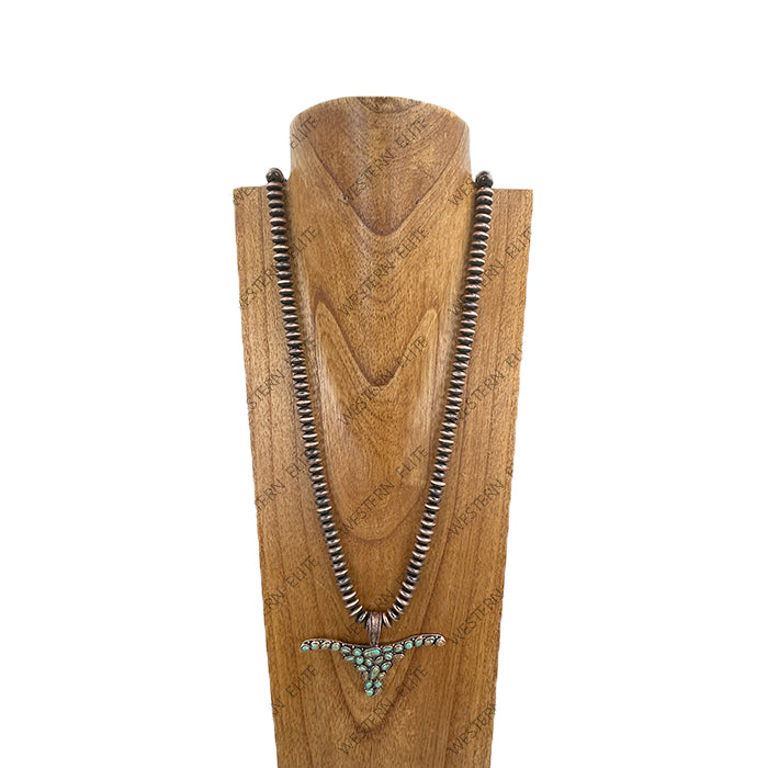 36'' Copper roundel Navajo pearl beads with blue turquoise stone long horn pendent Necklace
