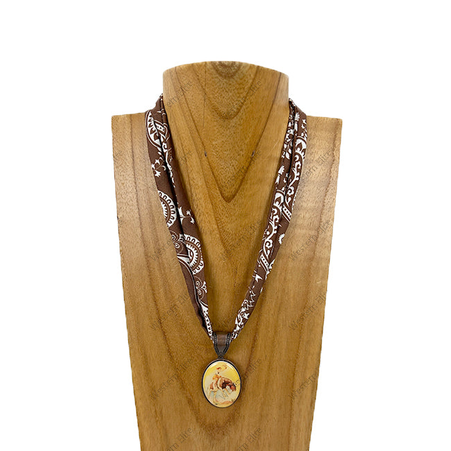 NKY260120-12 16'' Silk feeling scarf with oval western pendent Necklace