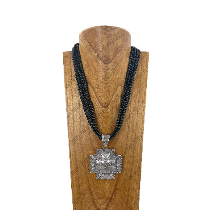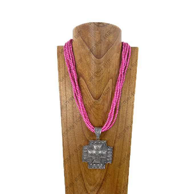 NKZ240825-04 Six Hot pink sequin beads strings with large silver metal cross Pendent Necklace