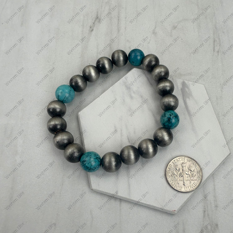 10 mm Silver Navajo pearl with blue turquoise stone beads stretch Bracelet