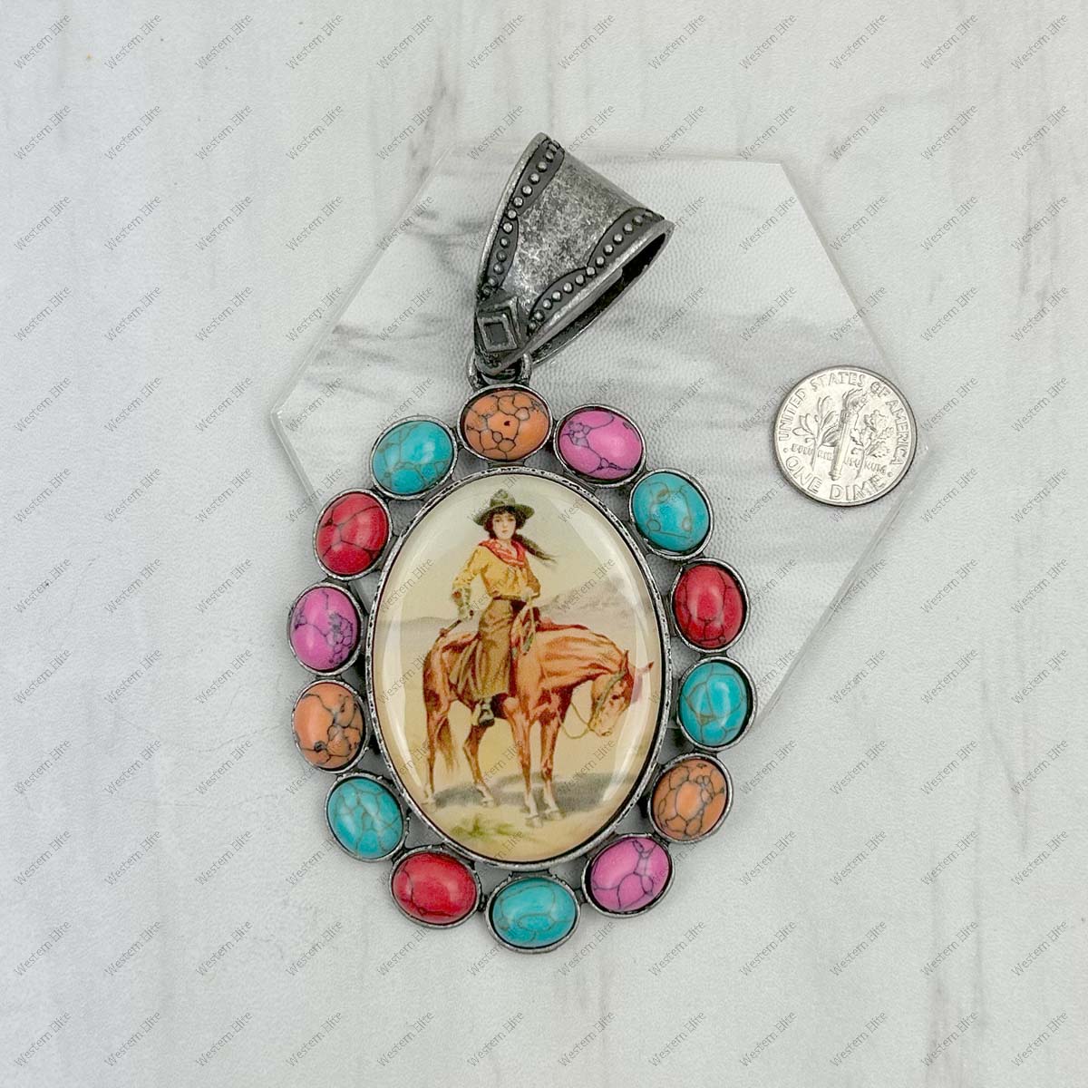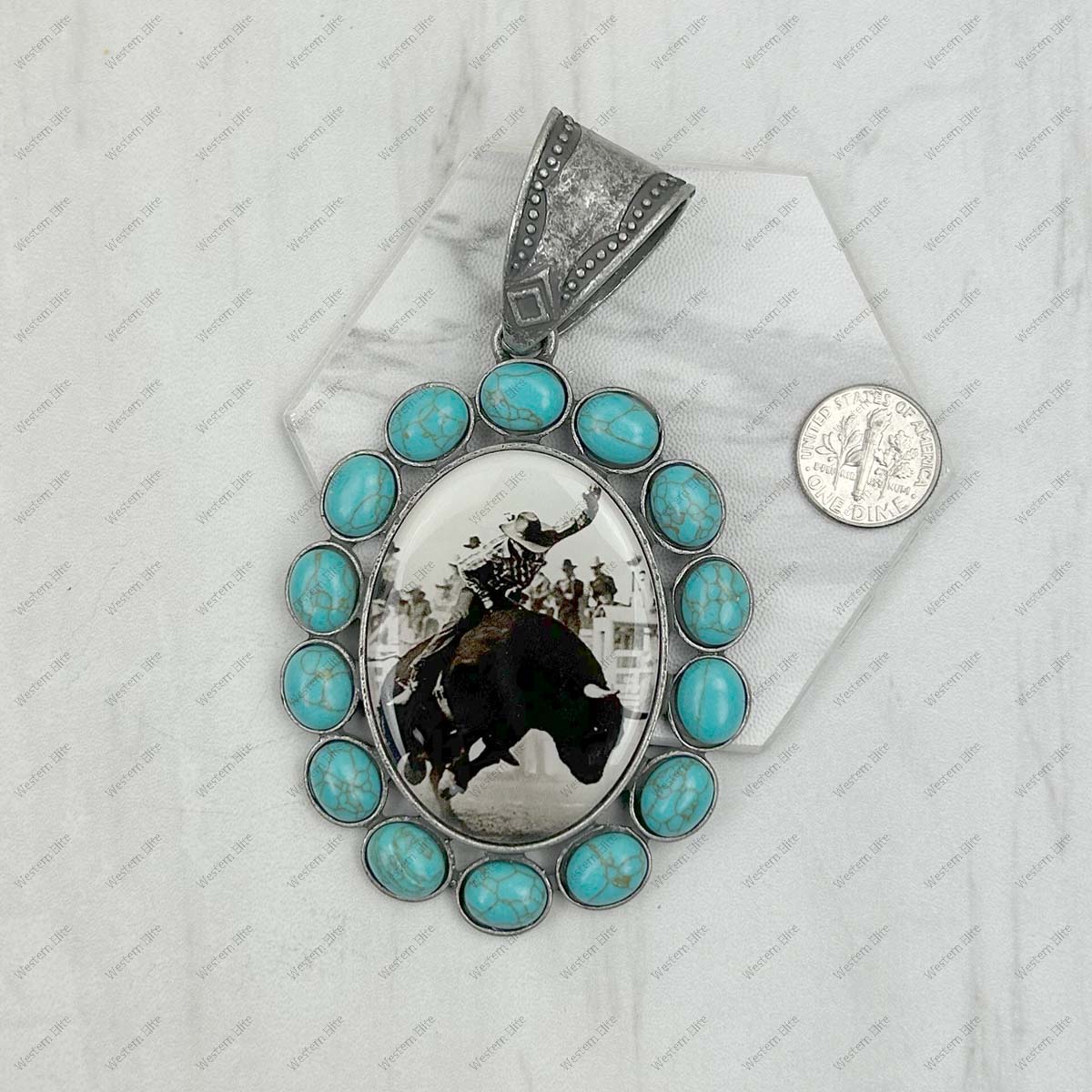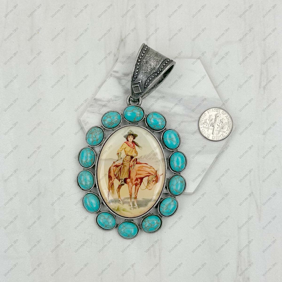 PD231210SL-29 silver metal with blue turquoise stone oval cowboy Pendent