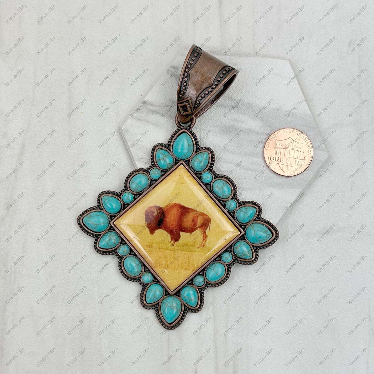 PD231210CP-21 Copper metal with blue turquoise stone square cowgirl Pendent
